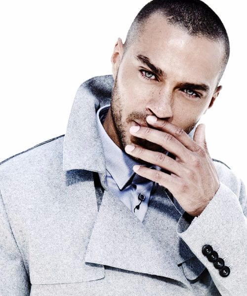 Hvem har brug for flere hårpynt, når du har øjne som to skår af is, der er klar til at trænge dybt ned i din sjæl? Her er Jesse Williams, der har en buzz -snit, med en tilbagegående hårgrænse og en enker top.