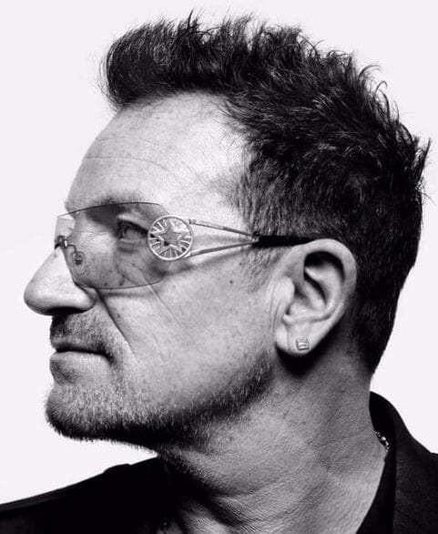 Her er et ikonisk ansigt, hvis der nogensinde var et. U2-forsanger Bono med sine berømte solbriller er faktisk et af de mest kendte ansigter i verden. Han har altid holdt sit hår meget kort med et par pigge på toppen.