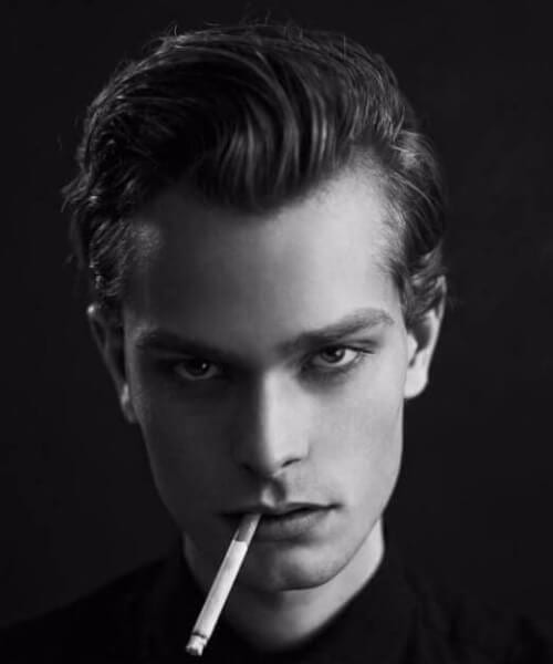 Dette er en høj og bølget pompadour , der er blevet glat tilbage ved hjælp af en kam. Hvis du undrer dig over, hvordan det forbliver på plads som det, er det ved hjælp af hårspray. Brug det i rigelige mængder, afhængigt naturligvis af længden af dit hår.