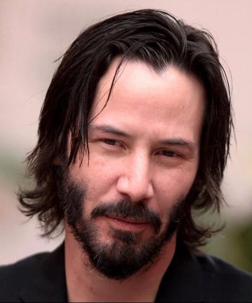 Selvom han ligner Jesus på dette foto, er Keanu Reeves stadig et stilikon og en inspiration for os alle. Hans lange hår er blottet for smell, men du kan stadig se, at han også har en lille enker top lige midt i panden.