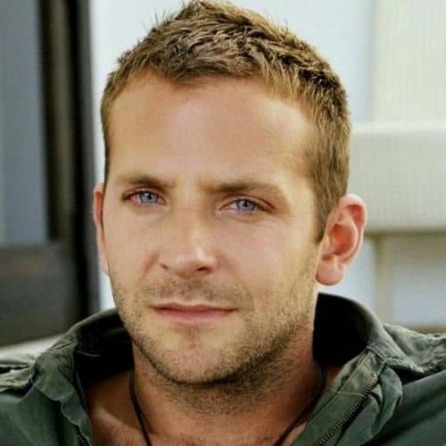 Apropos aus gutem Aussehen und durchdringenden blauen Augen, hier ist Schauspieler Bradley Cooper mit einem sehr schneidigen, bewachsenen Summen für hohe und enge Frisuren für Männer. Er kombinierte dies mit einer militärischen Jacke und einer Lederkette.