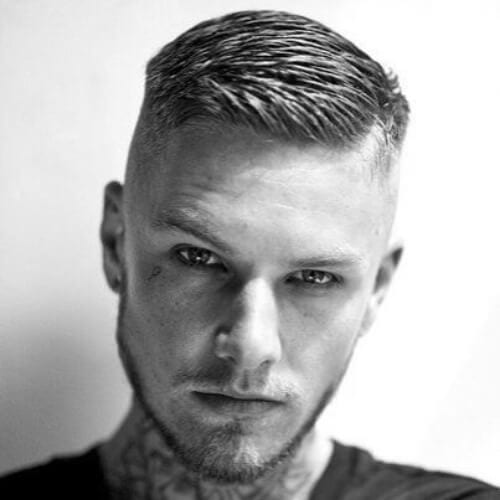 Wenn Sie ein ovales Gesicht haben und es noch weiter verlängern möchten, können Sie diesen raffinierten kleinen Trick ausprobieren. Gehen Sie für eine sich verjüngte oder eine kahle Rasur. Die verblassten Seiten des Kopfes lassen ihn schlanker und damit länger erscheinen.