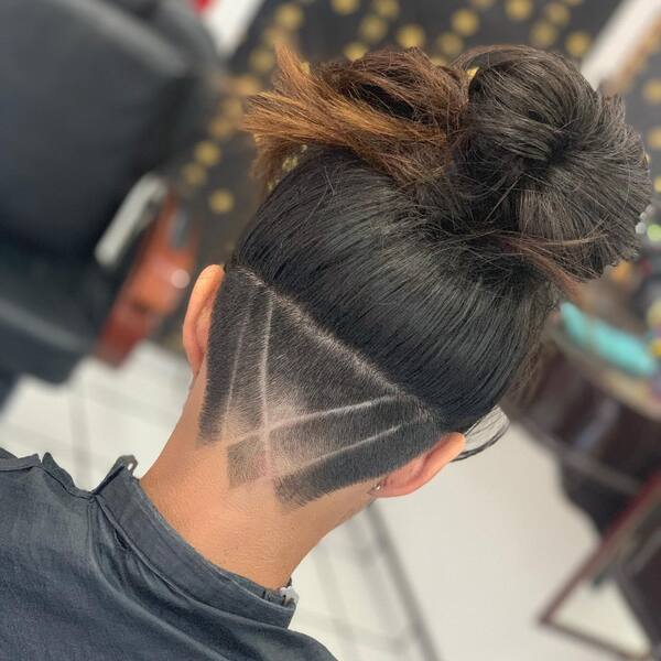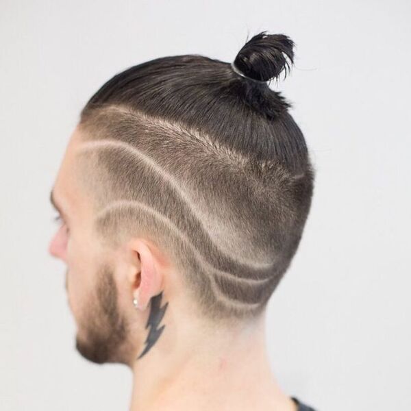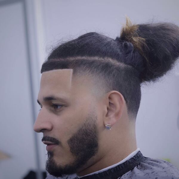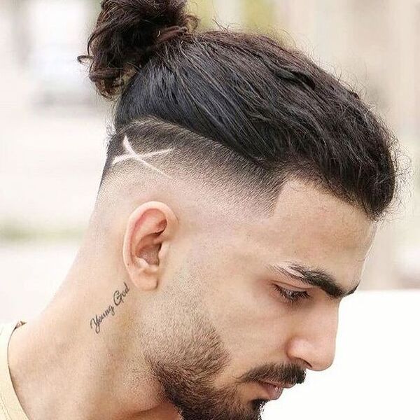 Voit jopa paritella linja -alukset pitkillä hiuksilla. Upea esimerkki sen tekemisestä olisi sitoa hiuksesi manbuniin. Pitäen miehen pullaa, voit parantaa alittajan ulkonäköä tämän kaltaisen rivin leikkauksella.