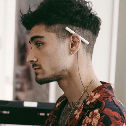 Tämä entinen ohjaaja on kapenevan haalistuvan merkittävä fani. Emme voi sanoa, että emme ole samaa mieltä hänen kanssaan, koska tämä kampaus sopii hänen kauniille ja herkästi veistettyille kasvojen piirteille täydellisyyteen. Zayn urheilee ärsyttävää ilmettä korvakoruilla, nastalla, nenälämpöllä ja massiivisilla tatuoinnilla.