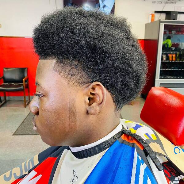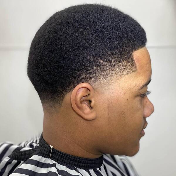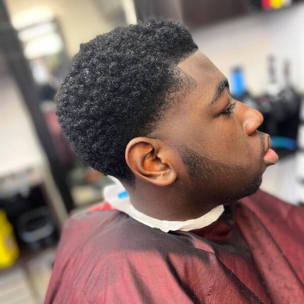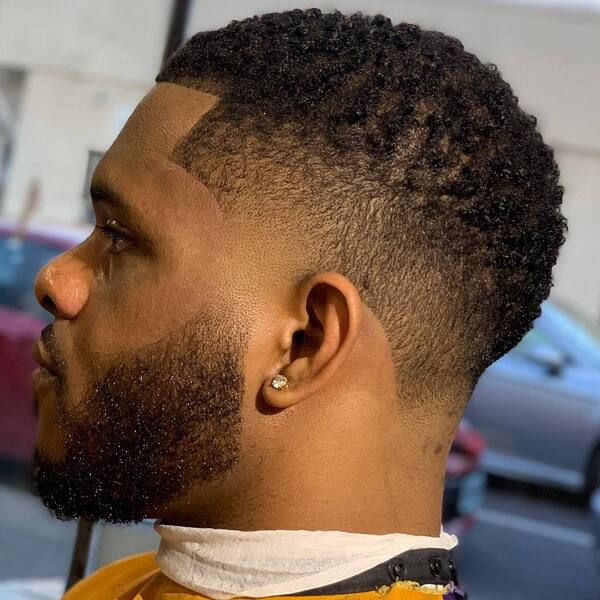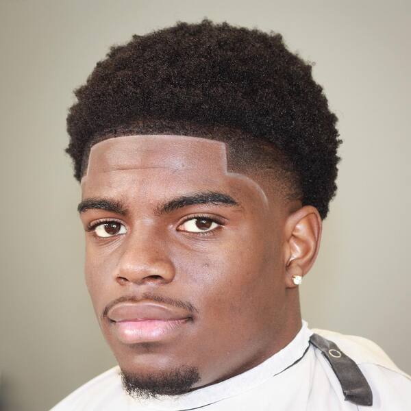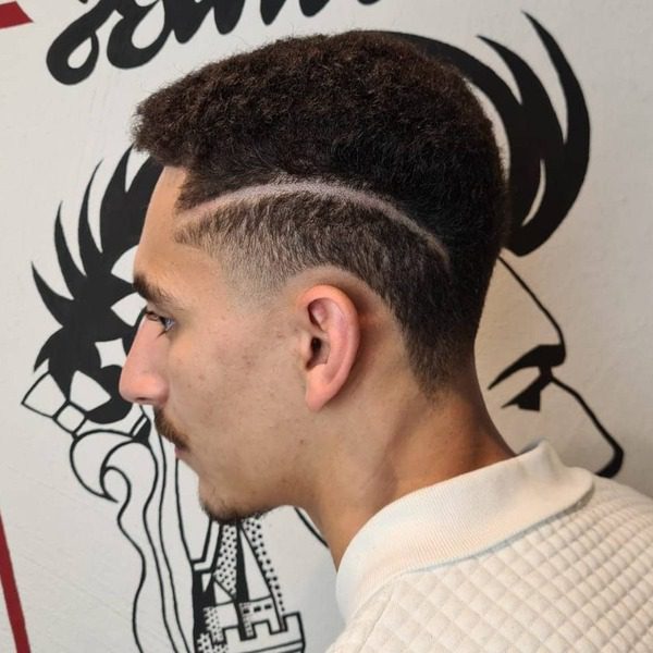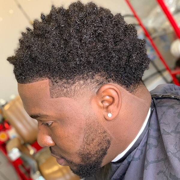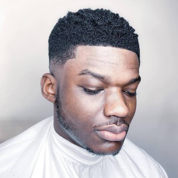 Cette coiffure suivante pour les hommes est un afro court avec de petites boucles et ils ont opté pour un conique bas comme choix de fondu. Si vous regardez attentivement, vous pouvez voir qu'ils ont deux designs coupés dans ses cheveux juste au-dessus du temple, mais vous pouvez toujours essayer de trouver votre conception pour que cela soit propre.