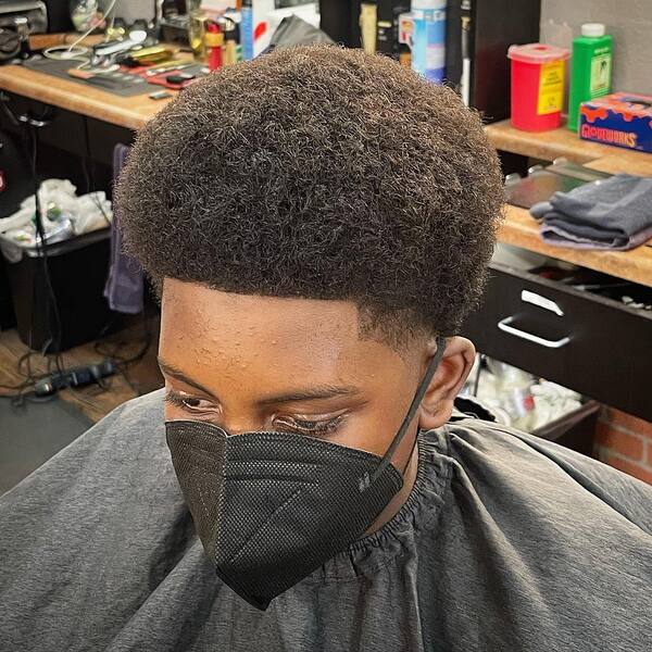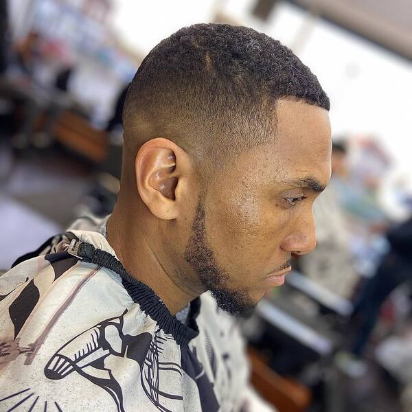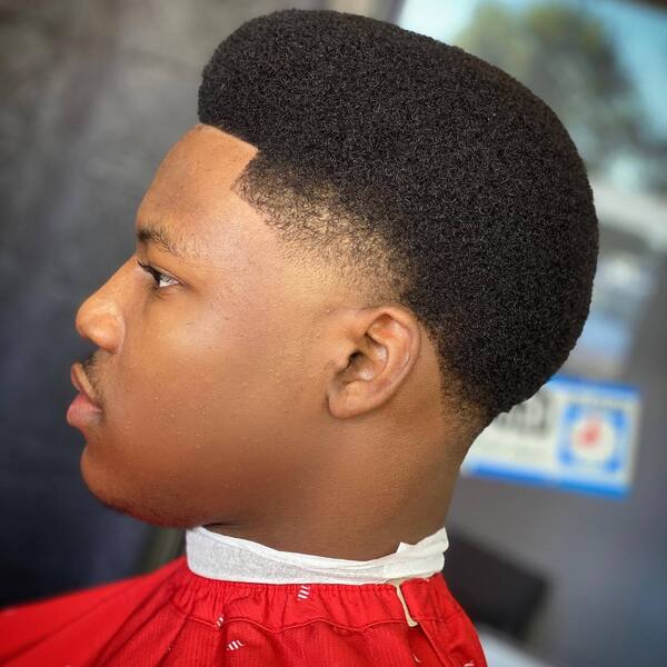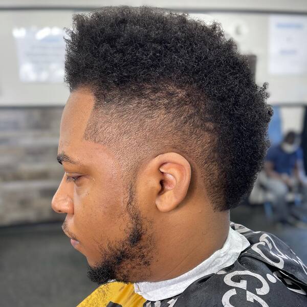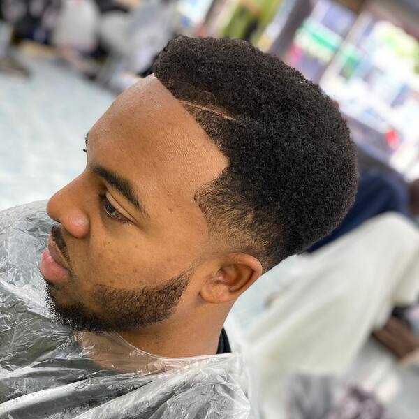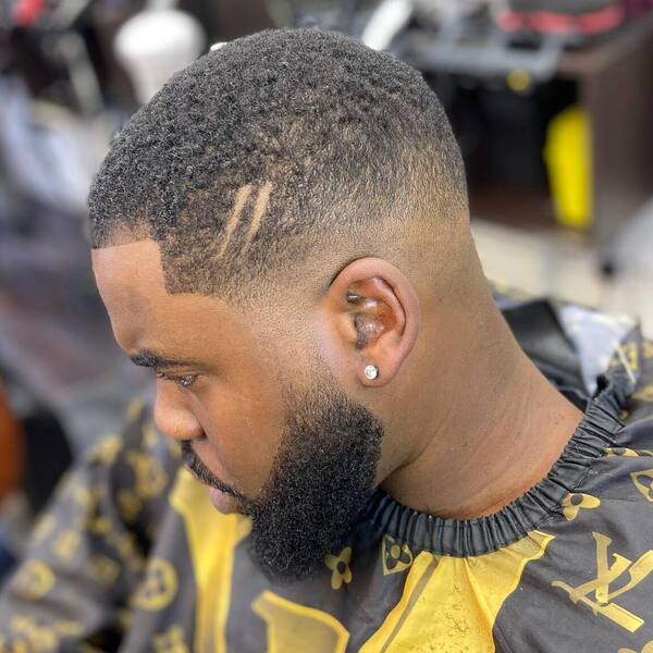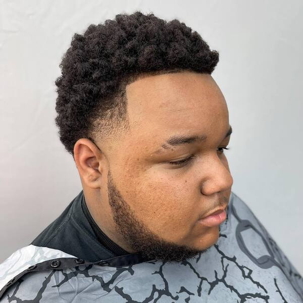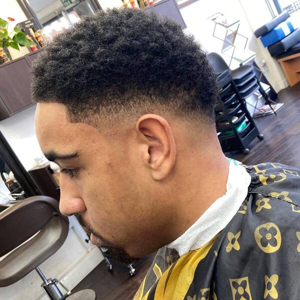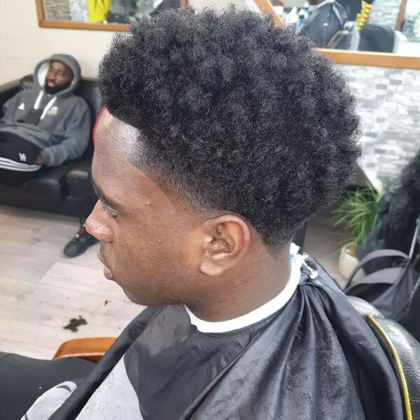 Cette coiffure suivante pour les hommes est un afro court avec de petites boucles et ils ont opté pour un conique bas comme choix de fondu. Si vous regardez attentivement, vous pouvez voir qu'ils ont deux designs coupés dans ses cheveux juste au-dessus du temple, mais vous pouvez toujours essayer de trouver votre conception pour que cela soit propre.
