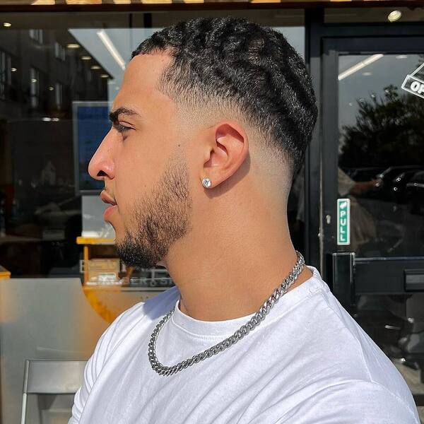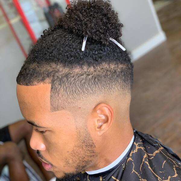 Pour tous les hommes avec de longues mèches bouclées, essayez de la tirer dans un chignon d'homme pour un look à celui-ci. Aucun style ne serait complet sans un fondu et pour ce style, il est allé avec un fondu à midle et c'était le meilleur choix.