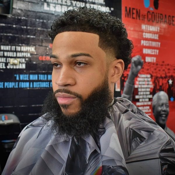 Afros avec un fondu de tobe à midle est toujours une bonne idée. Et ici, il a demandé une ligne rasée pour faire ressortir un peu plus de texture dans son style. Associez ce look avec une barbe comme sur la photo ci-dessus et vous allez vous sentir si confiant.