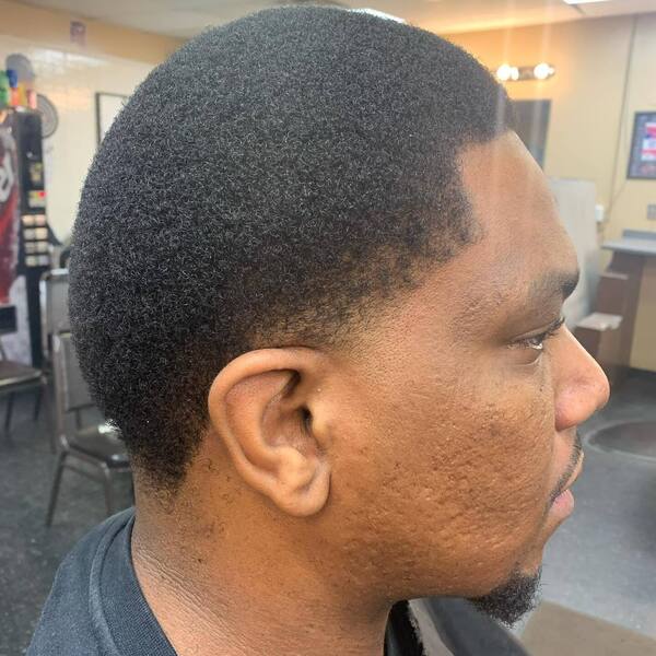 Ce style court et simple est appelé un afro lisse et ondulé qui a un fondu conique ajouté aux bords. Ce serait un style fantastique pour les hommes de tout âge à essayer car il a un look si classique.