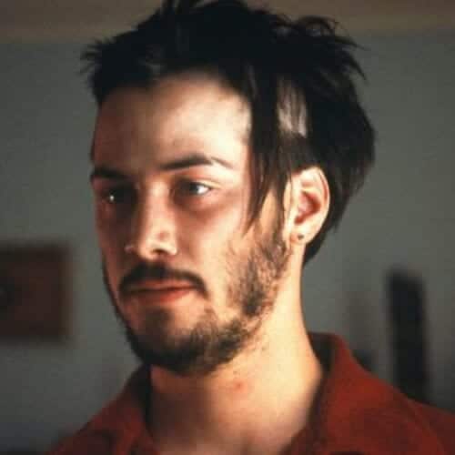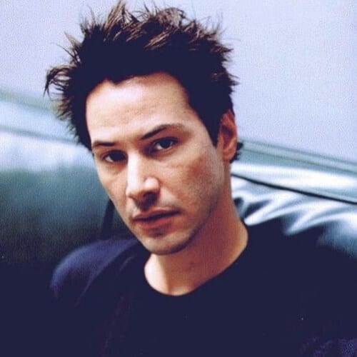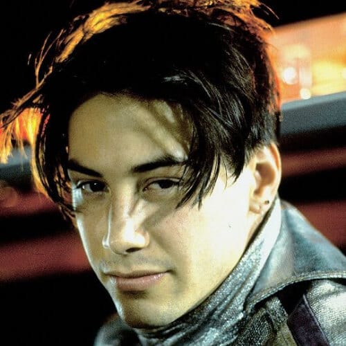 Il s'agit d'une coupe de cheveux plumeuse avec une autre partie latérale et une finition brillante que Keanu portait dans le film Johnny Mnemonic. Sa frange a été retournée et a créé un petit mur de pointes que vous pouvez recréer avec de la cire de cheveux.