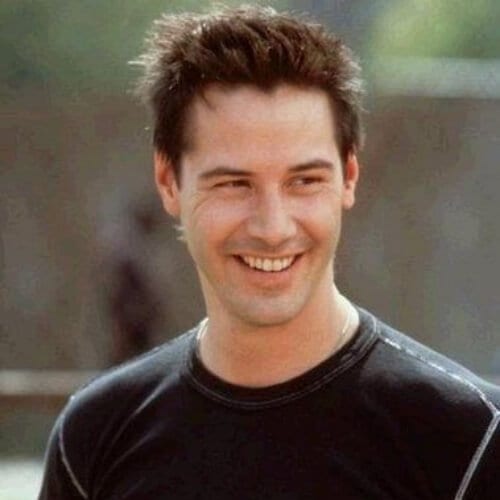 Commençons par un look décontracté que Keanu portait dans la trentaine. C'est une coupe de cheveux très simple et courte qui a été stylée avec un peu de cire de cheveux ou de gel capillaire. Cela signifie que vous pouvez facilement le reproduire vous-même à la maison.