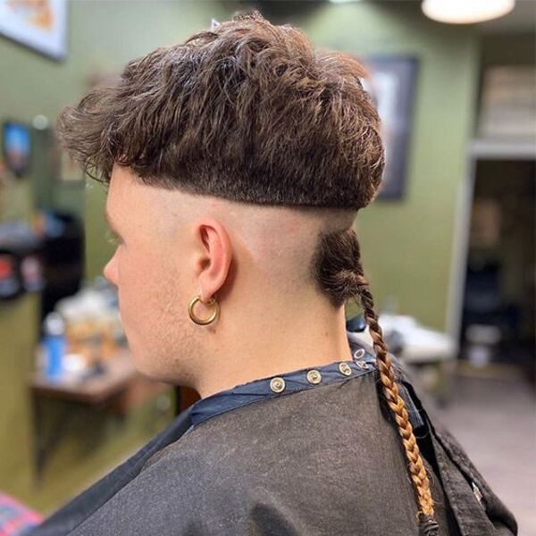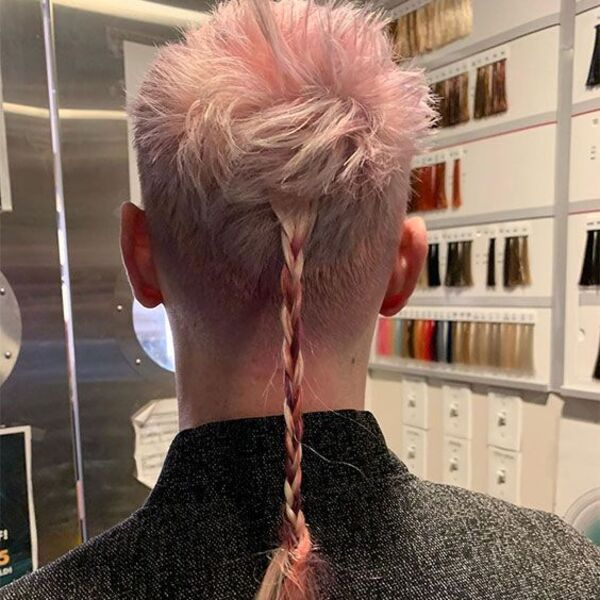 Cette coiffure pour hommes a un combo de quelques styles différents. Il a une pointe rose dans la section supérieure de ses cheveux, puis un joli fondu court sur les côtés et le dos, et enfin, il a une longue section tressée marron juste au centre de sa nuque.