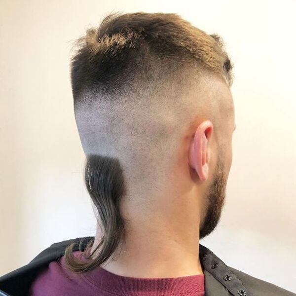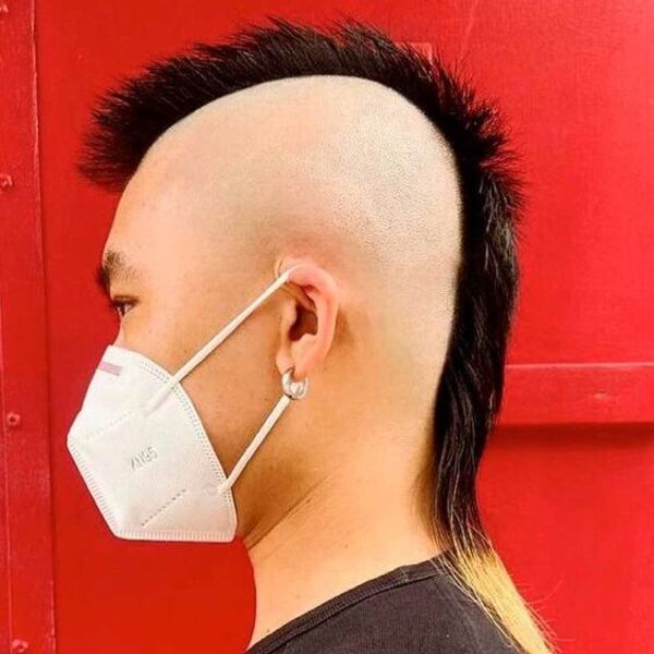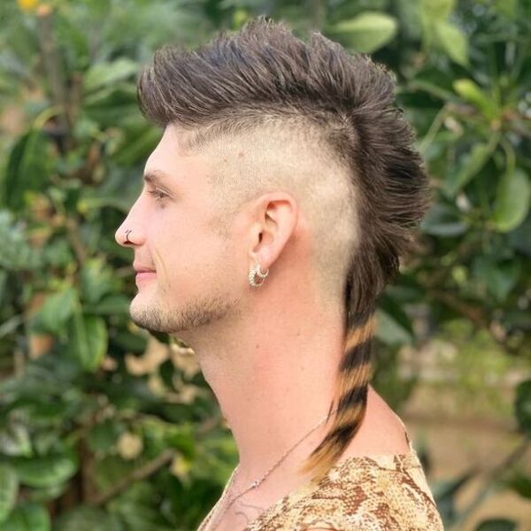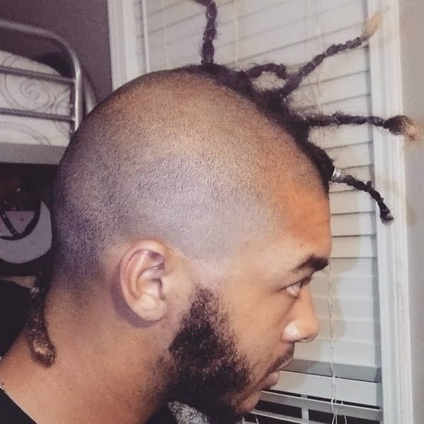 Débrancher les mohawks est si cool lorsqu'il est bien fait. Dans le regard ci-dessus, il a rasé les côtés de sa tête chauve et a quitté la section centrale longtemps et épineuse, mais a grandi sur la queue. Si vous voulez faire en sorte que la queue mohawk se démarque, encore plus, essayez d'ajouter une couleur blonde légère.
