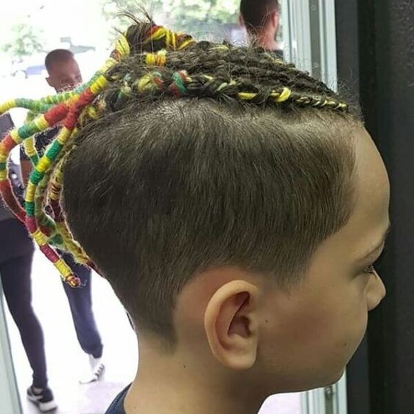 Toutes les queues ne doivent pas commencer au bas de votre style; Ce petit gars a tressé ses cheveux en 4 ou 5 sections et ajouté des couleurs amusantes pour faire sa queue. Essayez ce belvédère si vous avez un événement amusant à venir ou si vous voulez juste vous démarquer dans la foule.