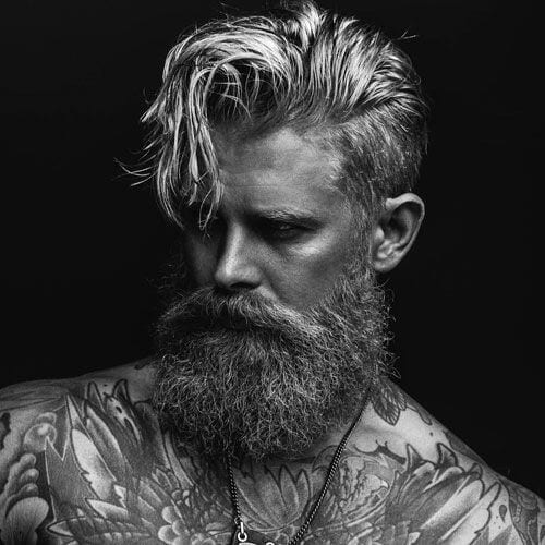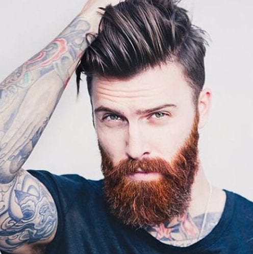 Même s'ils ont des cheveux noirs ou bruns, certains hommes ne peuvent faire pousser des barbes rouges. Nous soutenons l'idée de célébrer ce fait et d'afficher fièrement votre barbe de feu. Obtenez des tatouages et une coiffure de non-dépasse et montrez à tout le monde à quel point vous êtes vraiment un dur à cuire. Découvrez plus de coiffures pour les hommes à barbe .