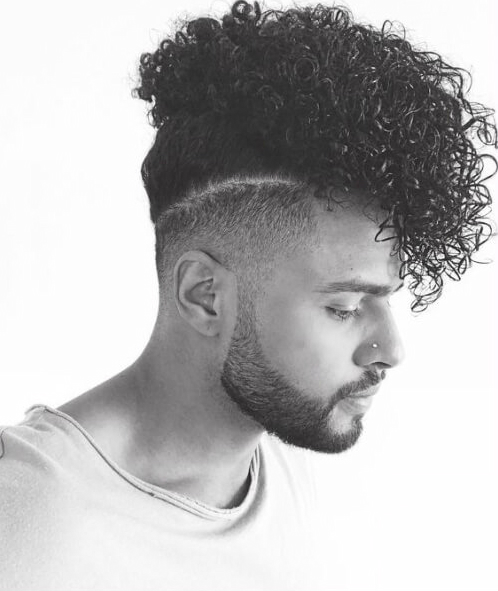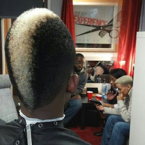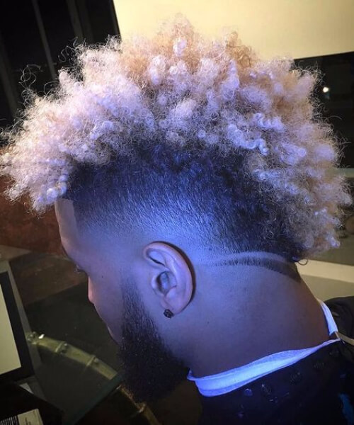 Jika ada sesuatu yang benar -benar kita sukai, maka itu gaya rambut mens hitam yang dengan berani menggabungkan beberapa potongan rambut menjadi satu. Misalnya, di sini kita memiliki mohawk keriting, dicat benar-benar pirang, dengan undercut yang dicukur dan desain garis leher berbentuk V untuk melengkapi semuanya.