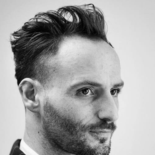 Terkadang, Anda dapat membuat secara vertikal untuk apa yang tidak Anda kekurangan secara horizontal. Ini adalah quiff tinggi atau versi pompadour - jika Anda lebih suka demikian. Itu menarik dari mata dari garis rambut yang surut dan membuatnya terlihat seperti Anda memiliki lebih banyak rambut daripada Anda.