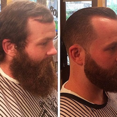 Inilah ide bagus ketika datang ke gaya rambut untuk pria dengan garis rambut surut. Ini adalah pudar lancip di luar wajah yang juga memiliki pompadour belakang yang disisir dan janggut yang dipangkas yang indah. Anda sudah dapat melihat efeknya di bidikan sebelum dan sesudah.