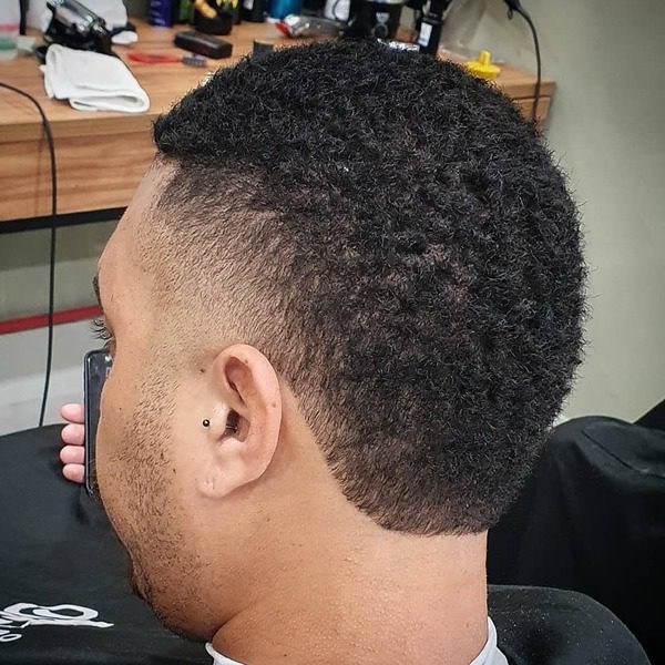 La prima acconciatura da controllare è questa temperatura per un afro. I svanisci del tempio sono molto popolari perché tengono i capelli attorno alle orecchie e nella parte posteriore corta e rifiniture.