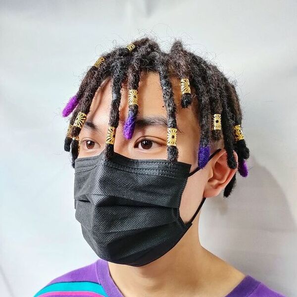 Questa bella acconciatura ha morbide tere afro con punte colorate e accessori. Qui hanno anche aggiunto una dissolvenza sotto per mantenere i capelli in ordine.