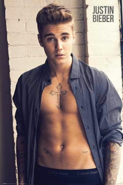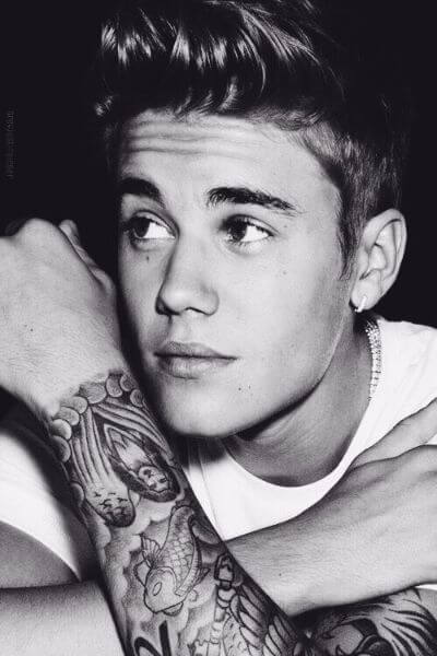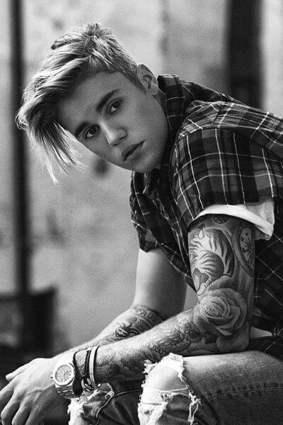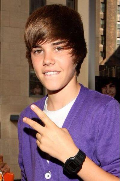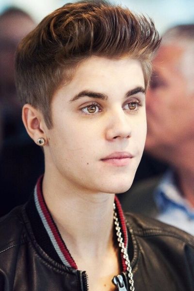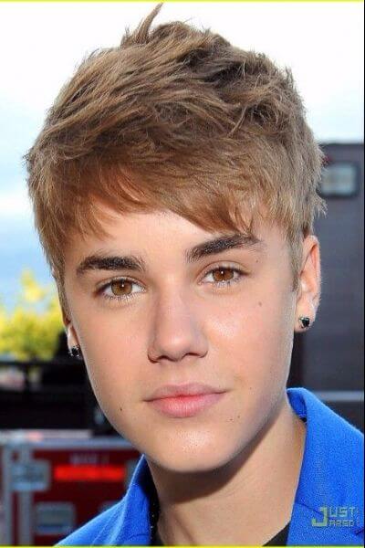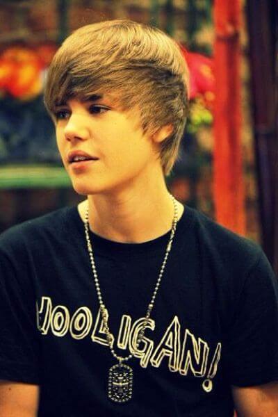 Questo taglio classico con frangiflutti corti è stato il primo look di Justins. È un taglio molto semplice che ogni ragazzo può provare. Il segno della firma è la frangia a strati che danno a questa acconciatura un bordo molto speciale.