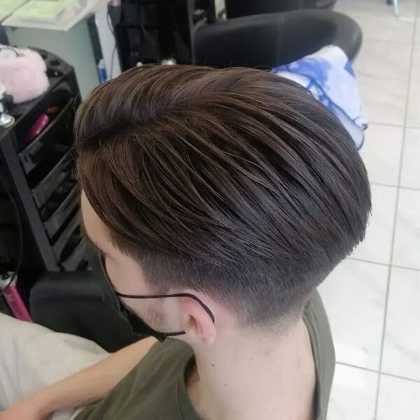 このフランス風のヘアカットには、頭の側面とうなじの周りに肌が薄くなっています。ここのフェードは、髪の毛の長い層と泳ぐことで融合します。どちらにしても、彼の見た目やブラッシュダウンをスタイリングすることができます。