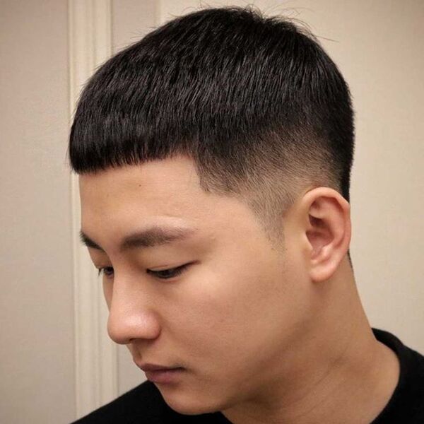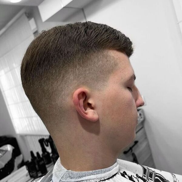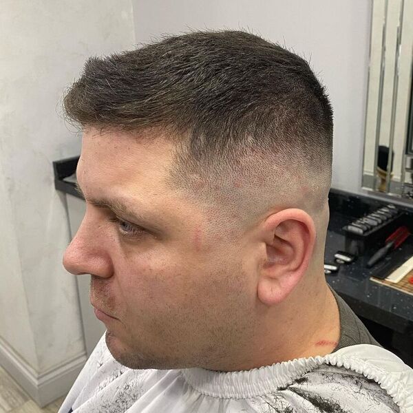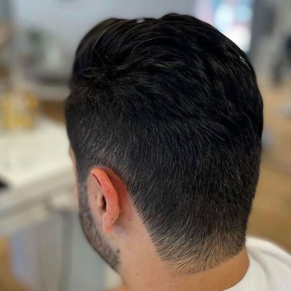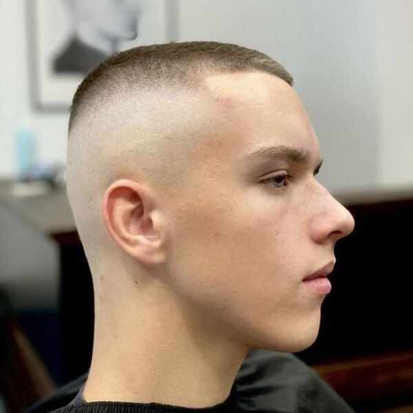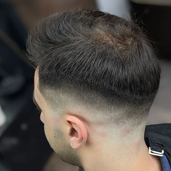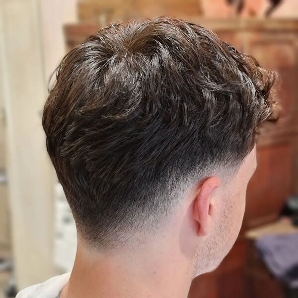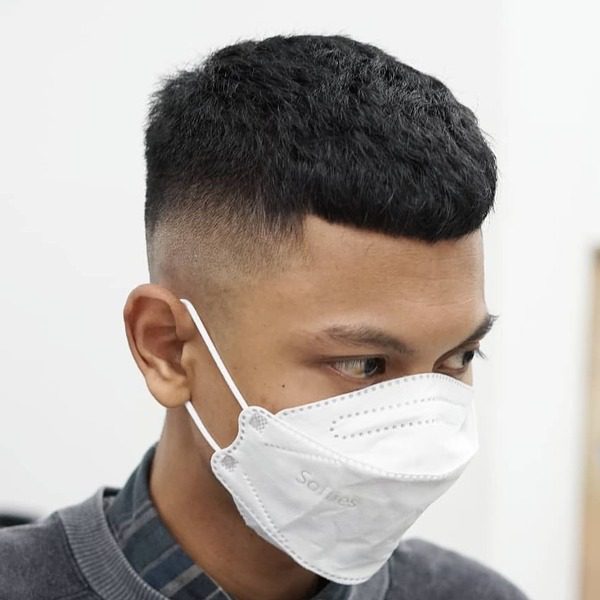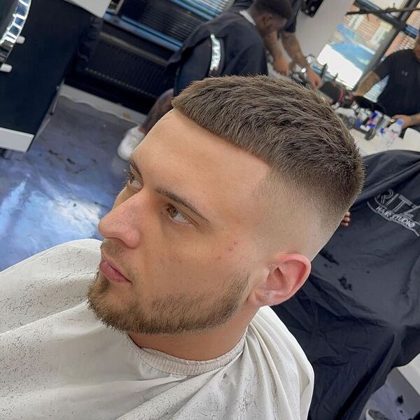 短いフェードで髪の毛を短い側に保つことは、朝のルーチンを削減するのに最適な方法ですが、それでもとてもドープに見えます。ここで彼はフランス式の作物であり、側面の短い髪に消えています。