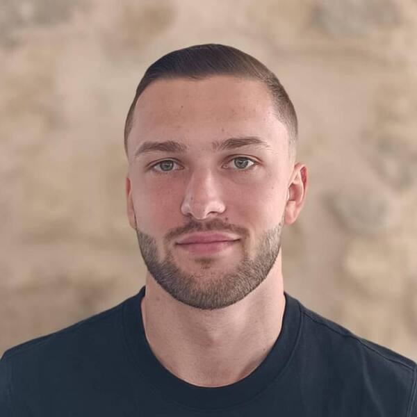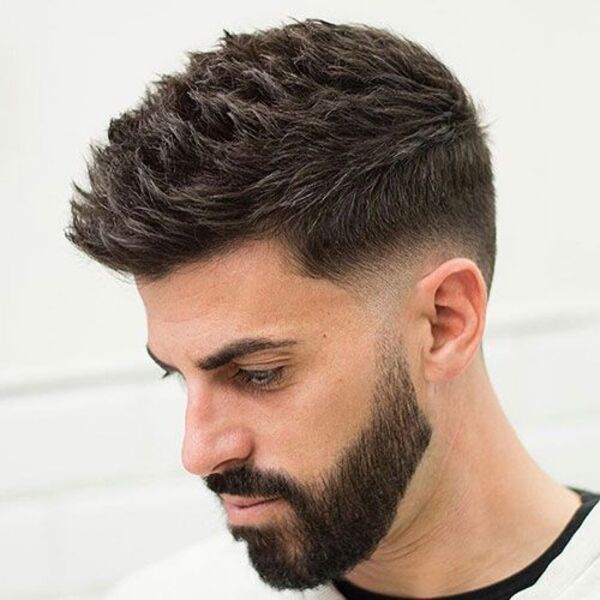 テクスチャーされた短い髪は、フランスの作物の髪型を持つ重要な要素の1つです。ここで彼は短い面で髪を切っていますが、フランス語やフェードのようなフランスのカットのすべての重要な要因がまだあります。