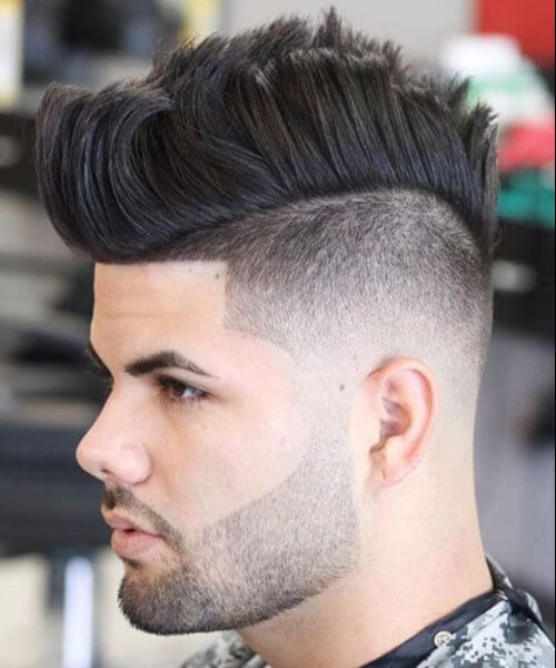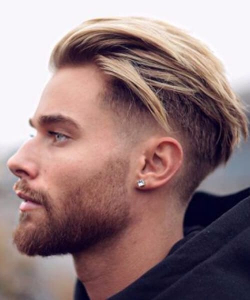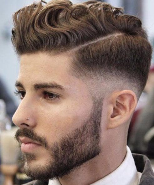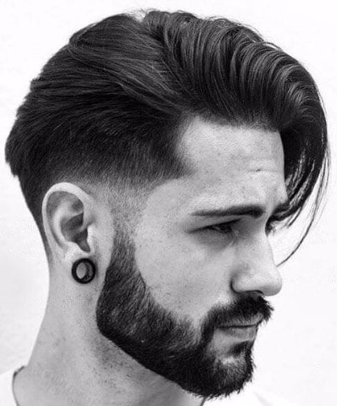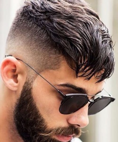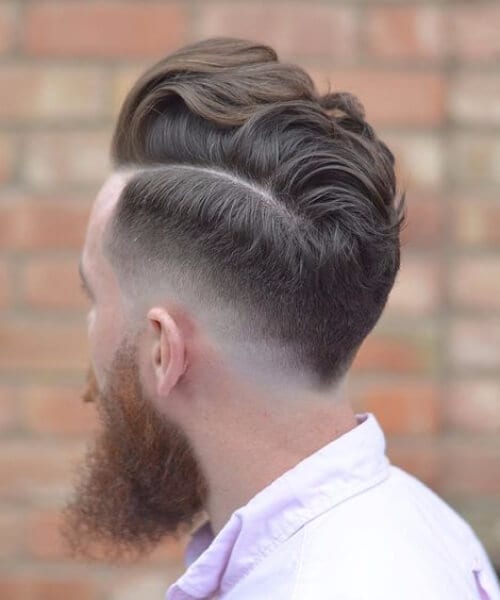 これは、片側に長い櫛が付いた低いテーパーフェードヘアカットで、完璧にゲル化され、一致するひげがあります。ここにいくつかのヒントがあります - このカットでどんな種類の別れにも行かないでください。髪とひげカットの完璧な組み合わせは、必要なものです。