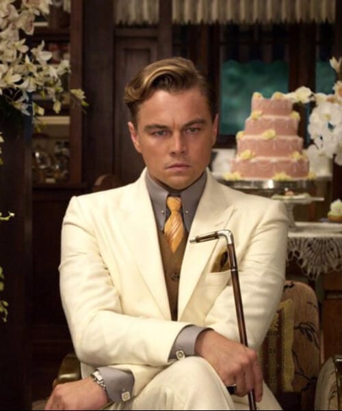 ギャツビーだけでなく、レオナルド・ディカプリオスがアメリカ文学で最も有名なキャラクターの一人を描いています。その典型的な1920年代のヘアスタイル、サイドパート、滑らかな寺院、そして正面に美しい長いカールがあります。