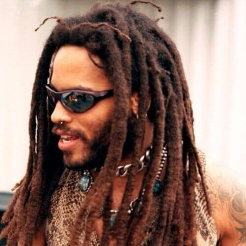 Daži puiši labprātāk šūpotu hipiju vai bohēmijas izskatu, viens ir līdzīgs Lenny Kravitz šajā fotoattēlā. Iezīmējiet savu satriecošo modes izvēli, dodoties uz garu un īpaši biezu dredu stilu vīriešiem.