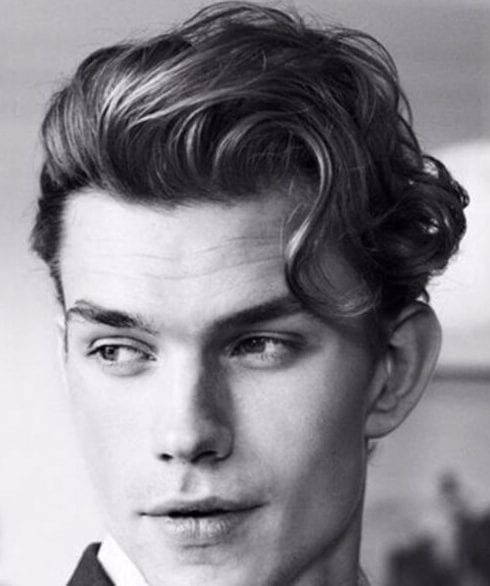 We moeten meteen zeggen dat dit, zonder twijfel, een van onze favoriete kapsels voor mannen met golvend haar is. Het leent zwaar uit de jaren 50 en 60 met een verbazingwekkende moderne draai. Het ziet er gewoon cool en fris uit!