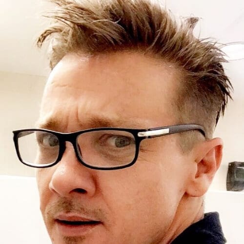Iedereen favoriete boog en pijl-zwaaiende Avenger, Jeremy Renner is een beetje een goofball in het echte leven, zoals bewezen door zijn kapsel. Hij heeft een ondersnijder met een korte en rommelige top met veel woelige lagen.