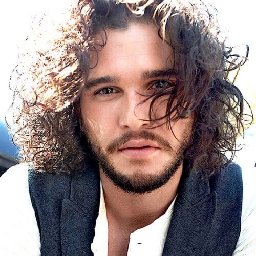 Hier is een perfect voorbeeld van hoe je een rommelig kapsel kunt dragen als je krullend haar hebt, ons door niemand minder dan Kit Harrington gebracht. Jon Snow, King in het noorden, draagt hetzelfde kapsel in het echte leven als in de show.