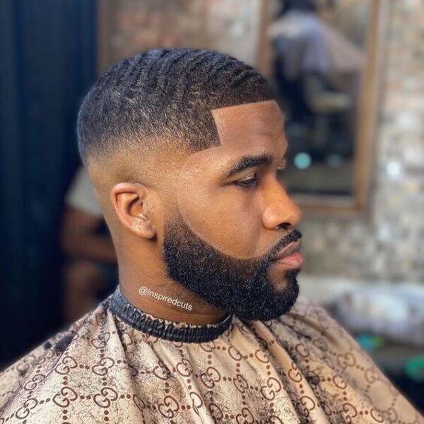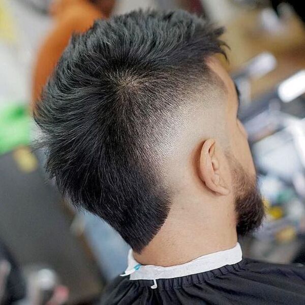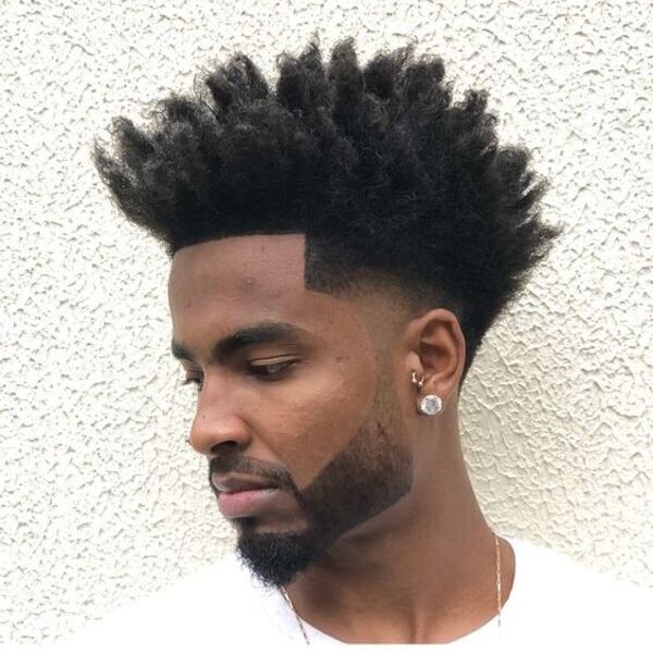 Burst Fades zijn nog een dope manier om te pronken met je stijlvolle kant. Hier draagt hij een burst -fade met een Mohawk -afwerking en het ziet er zo cool uit, maar nog steeds erg professioneel.