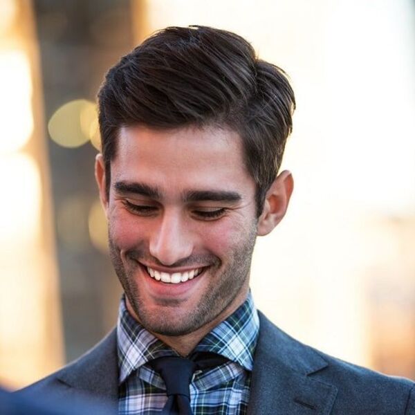 Deze knappe man draagt zijn haar in een informeel kort kapsel. Zijn haar is mooi getrimd rond deze natuurlijke haarlijn en gescheiden aan de zijkant en het ziet er perfect uit voor elk werkevenement.