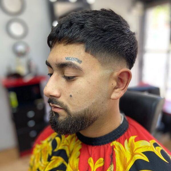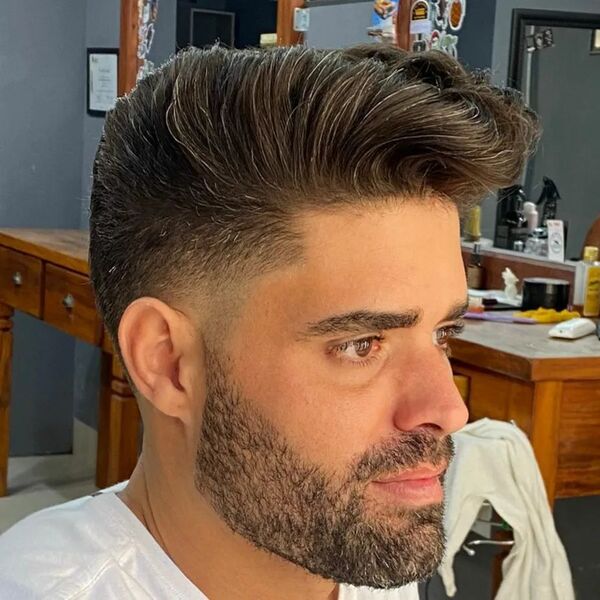 Geborstelde en gelaagde kapsels zijn altijd een goed idee. In deze look heeft hij ook een perfect opgestelde baard toegevoegd en de twee looks zijn een perfecte combinatie.