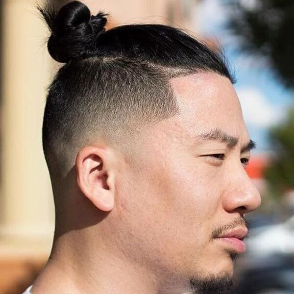 Topknopen zijn weer een geweldig kapsel voor de professionele man. Hierboven heeft hij een mooie gelijkmatige buzz gesneden rond de zijkanten en rug en het haar omhoog wordt lang genoeg achtergelaten zodat hij het in een eenvoudige topknoop kan trekken.