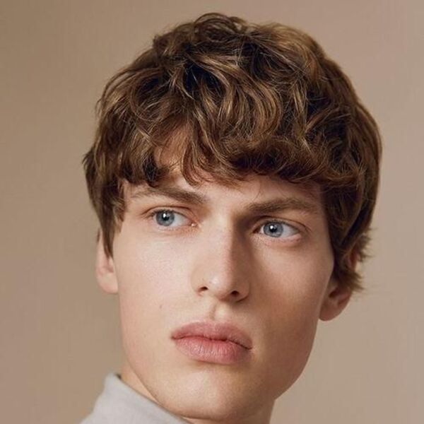 Deze dapper fellow draagt zijn glanzende krullende haar zo modieus. Hij heeft hier een glanzend krullend kapsel en je kunt dat ook krijgen met de juiste stijl en haarproducten, vraag je kapper wat ze aanbevelen, zodat je er ook de hele dag glanzend uit kunt zien.