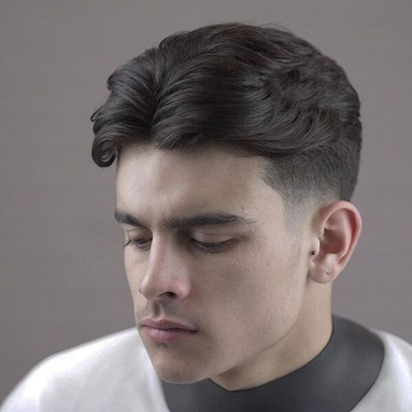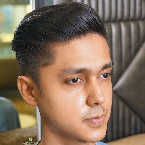 Slicked-back looks zijn altijd een hit op kantoor. Op de foto hierboven draagt hij een vervaagde ondergingslook met de rest van zijn haar in bijna een pompadour -stijl geduwd.