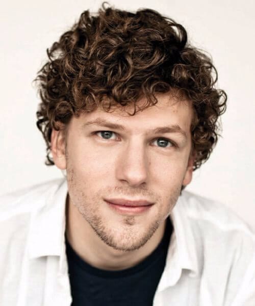 Wist je dat Jesse Eisenberg ook krullend haar heeft? Nu doe je dat, en je kunt je haar beginnen te dragen, net zoals hij. Dit donkere bosbruin laat zijn groene ogen eruit springen en het past bij de stoppels van een baard. Snijd je baard dun en laat je krullen dominant blijven.