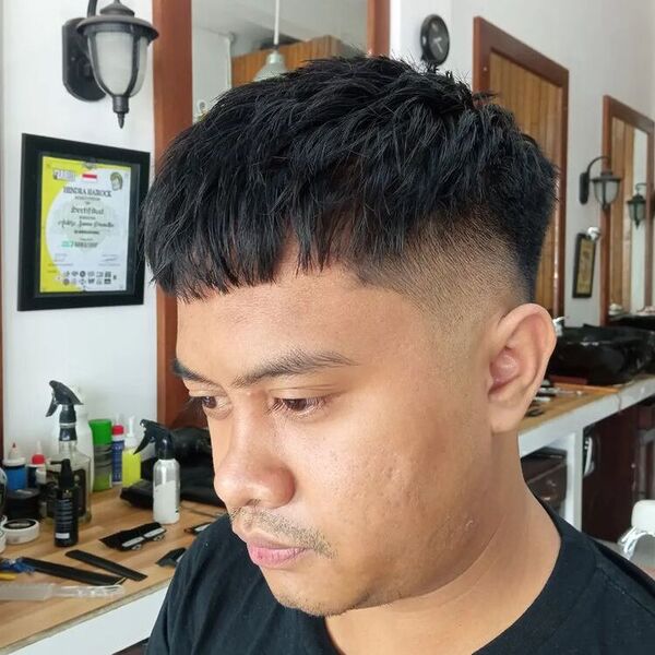Fransen zijn slechts een chique woord voor pony, en dit kapsel zou niet compleet zijn zonder hen. Hij heeft ook een laag fade kapsel rond de oren en het laat het haar bovenaan langer verschijnen.