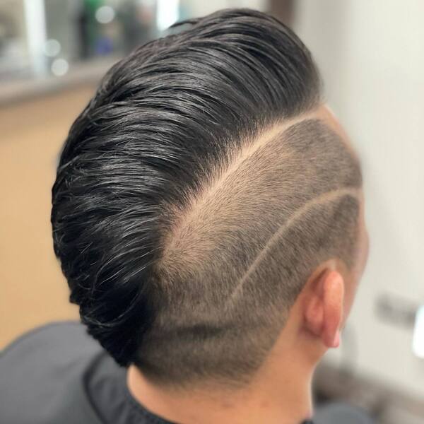 Her er en kortere frisyre for menn med en faux hauk og en hud blekner rundt sidene. Ta din nye stil til neste nivå og legg inn en fin barbert buet linje. Denne stilen vil skille deg ut fordi de fleste menn ikke er modige nok til å bli kreative med håret.