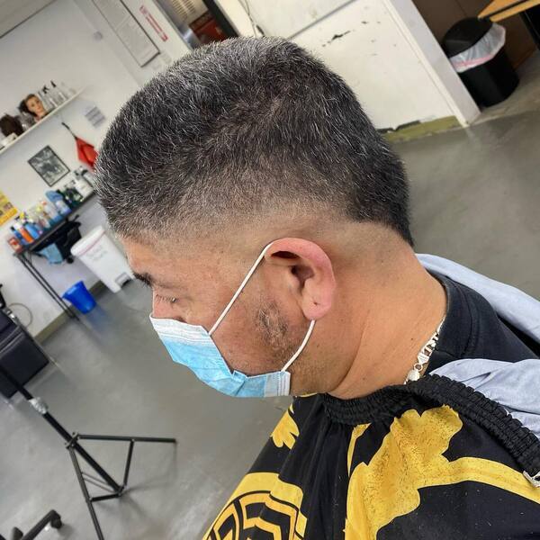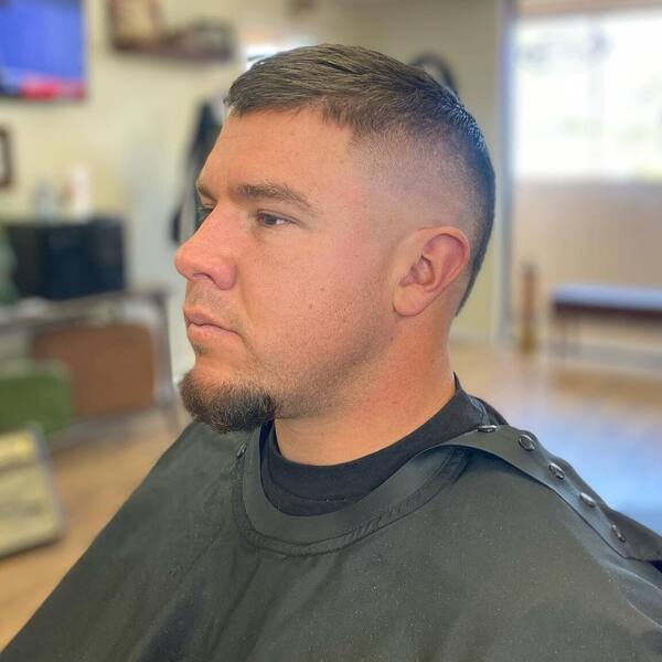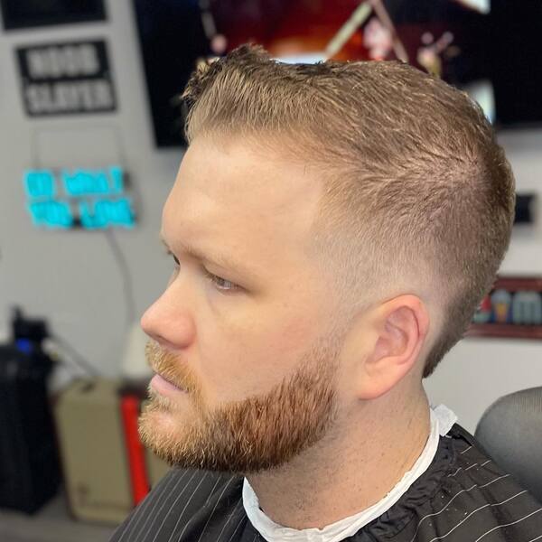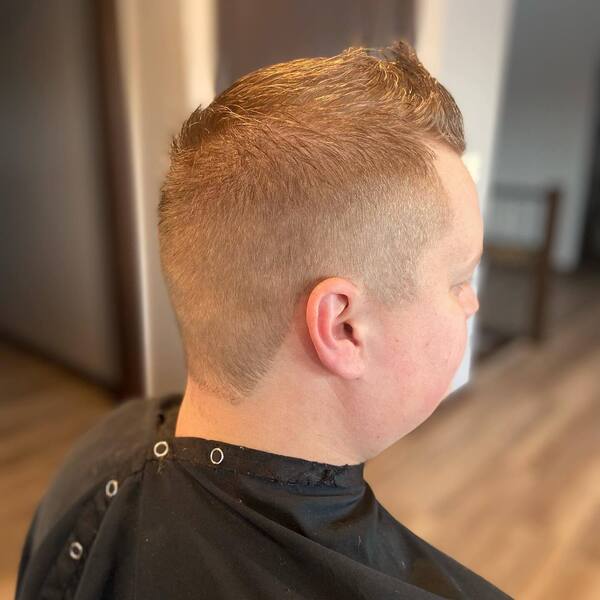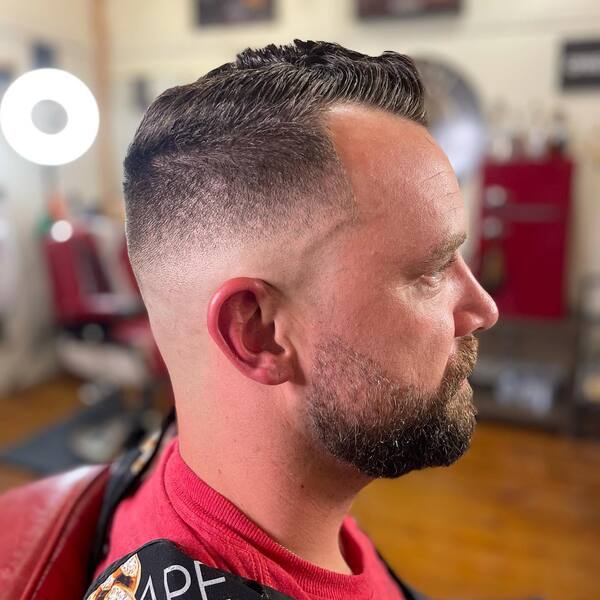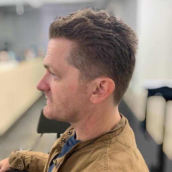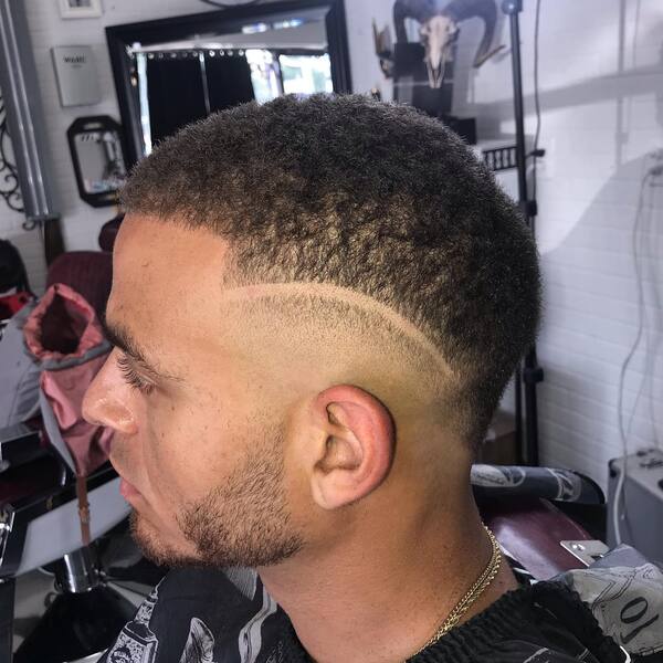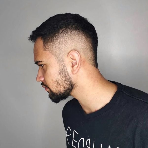 Buzz -kutt ser bra ut på menn i alle aldre på grunn av det, dette ville være et godt valg for din neste frisyre. På bildet over har han på seg håret med en buzz-kuttet faux hauk og med et tempel falmer rundt ørene, og det ser fantastisk ut.