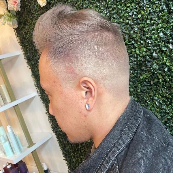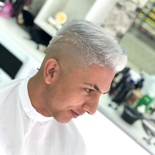 Hvis du vil legge til litt mer farge i livet ditt, kan du prøve dette Platinum Blonde Freestyle -utseendet. De har en fin falming rundt sidene med en innkoblet design. For det øverste hårlaget har de lagt til en liten mengde hårprodukt og stylet det opp i en fristil type utseende.