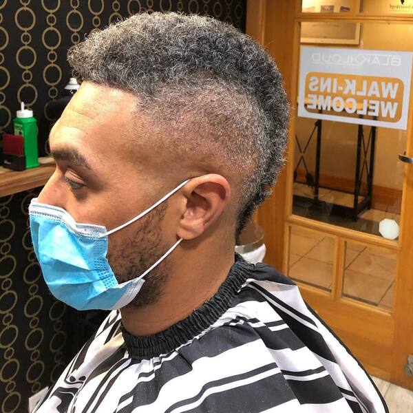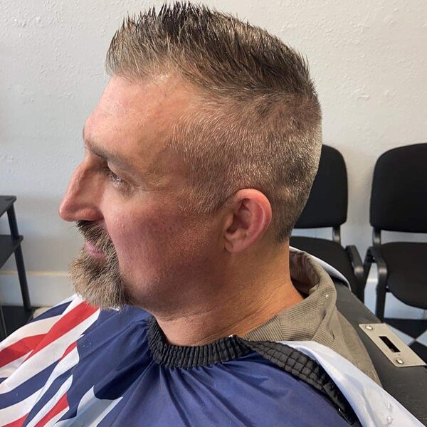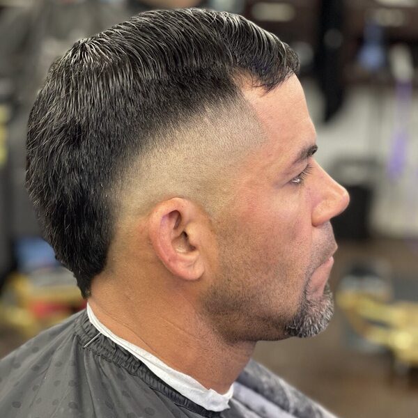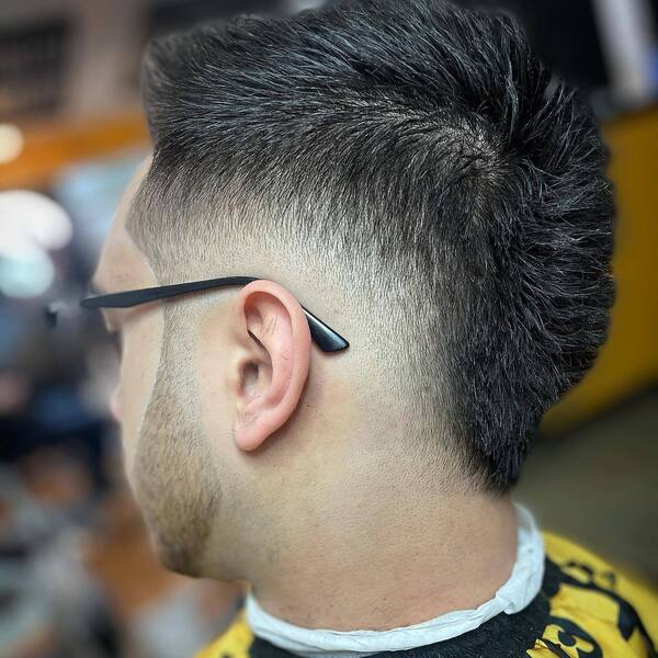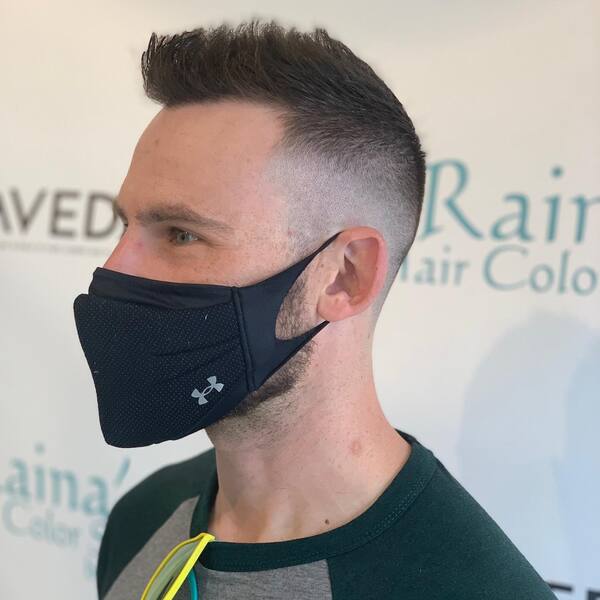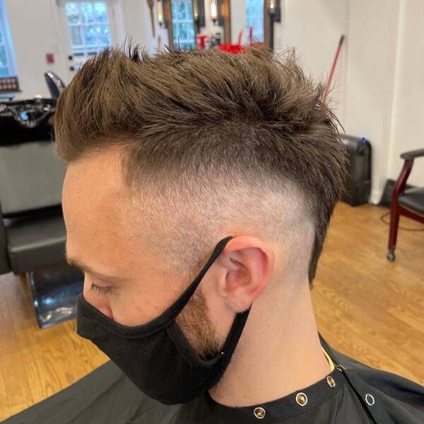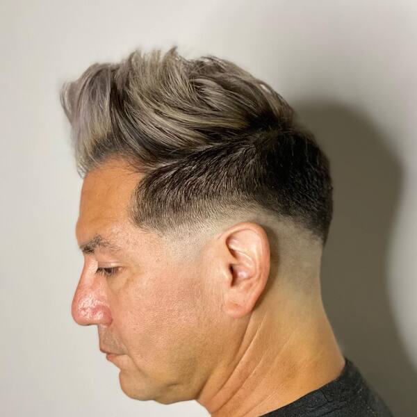 En høy hudfade ser bra ut på menn i alle aldre, og den ser enda bedre ut når du binder denne stilen sammen med en pigge hauk. På bildet over har han også vokst skjegget ut, og det ser perfekt ut.