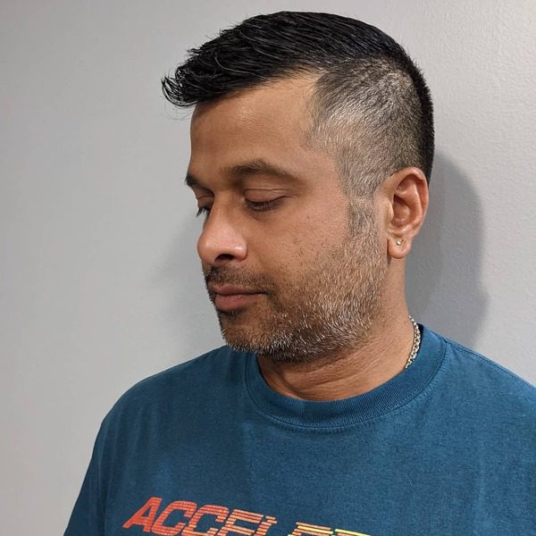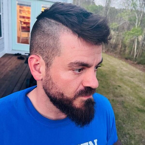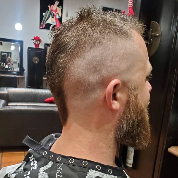 Underskjæringer er en av de beste måtene å holde kantene se friskt ut og holde alt på rett sted. Denne faux -hauken er tykk på toppen som en ekte mohawk, og han har også vokst ut skjegget, og den har en ekte rocker -stemning.