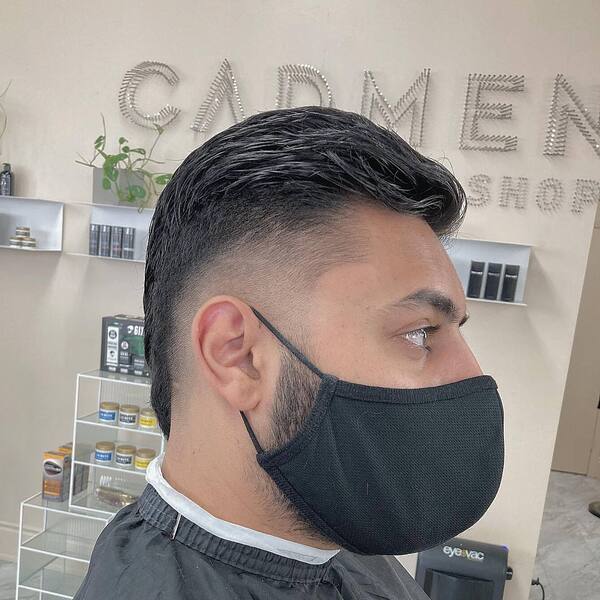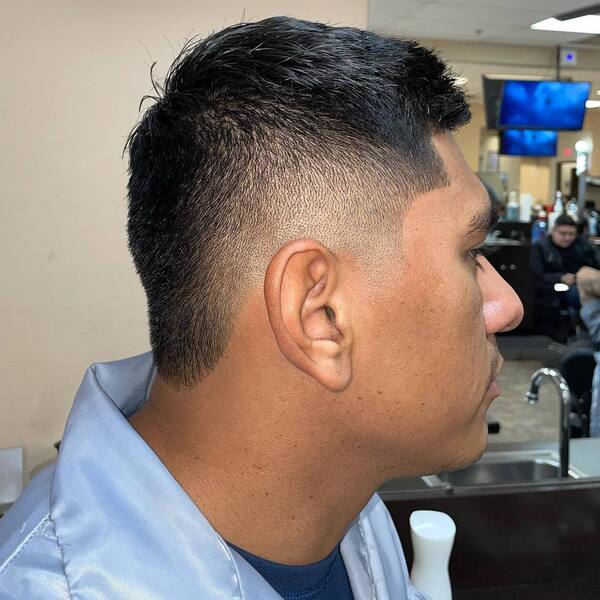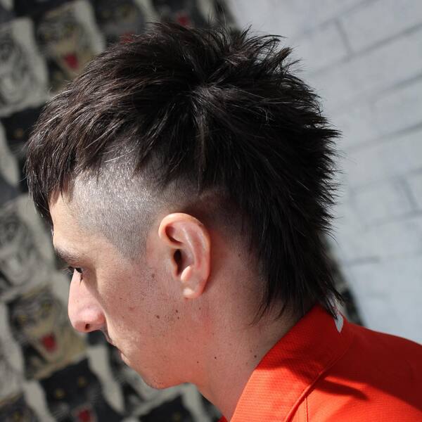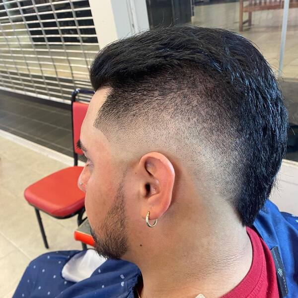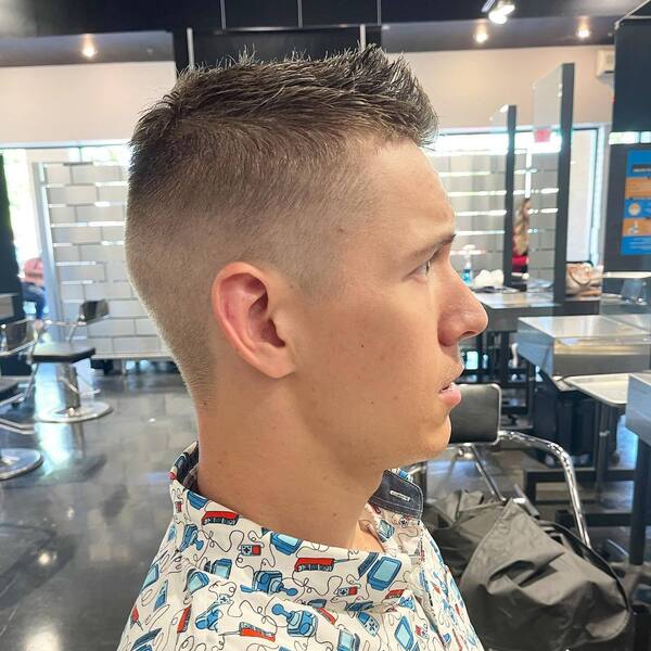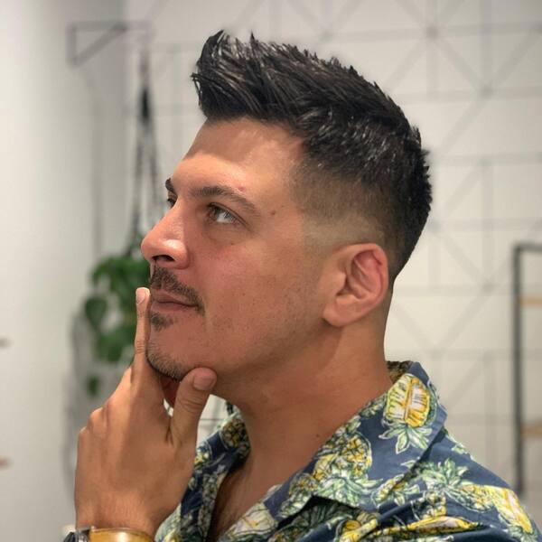 Denne neste frisyren er en strukturert faux Hawk -frisyre for menn. Han har en fin selv falske rundt sidene som starter rett over øret på bildet over, og det ser så kjekk ut.