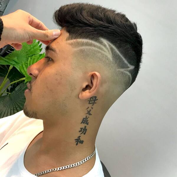 Wow, denne freestyle Fade har en slik dope -design rundt hodet. Denne kjekke frisyren for menn har også en freestyle faux Hawk -frisyre, og du kan bruke den pigget opp eller børstet ned for en fantastisk finish.