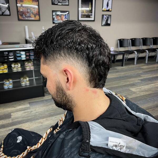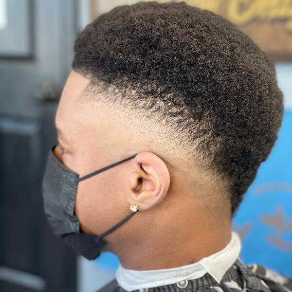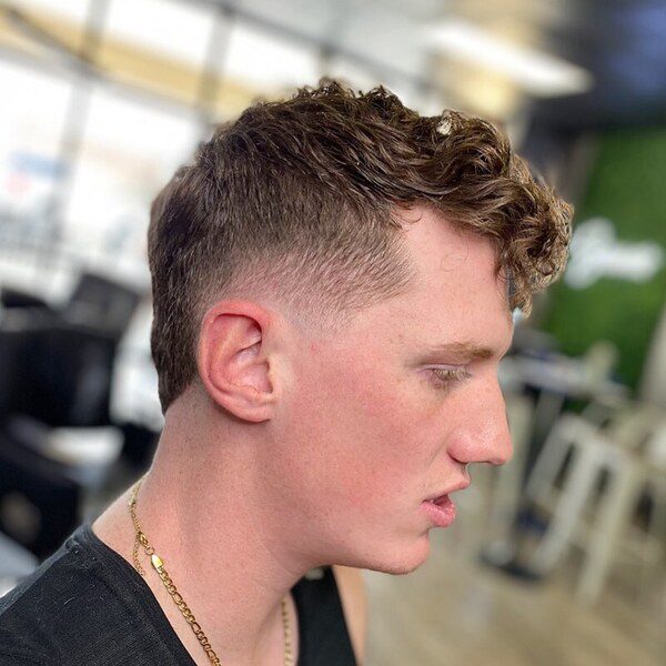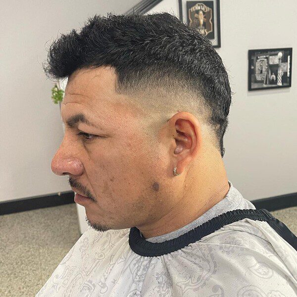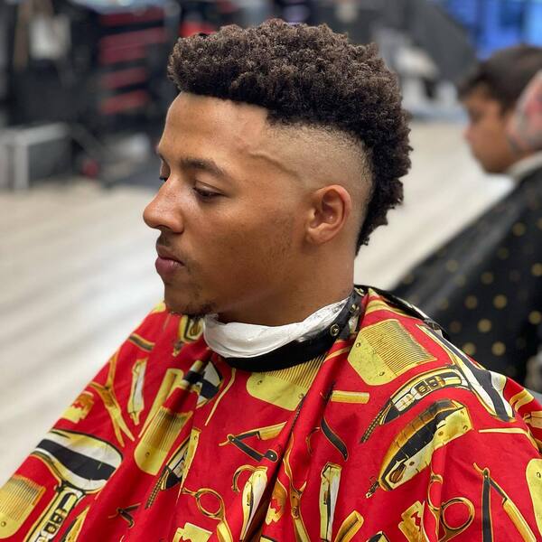 Her er en faux hauk med høy topp med en hudfade. Dette er en fantastisk krøllete fade -frisyre for deg å prøve ut hvis du har tykt og krøllete hår. De holdt håret på toppen krøllete og naturlig for en frisk og unik stil.